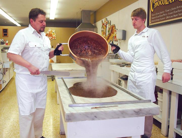 SEE IT MADE! Watch our candy craftsman seven days a week. July and August open 7 days a week and evenings. Cooked in a copper kettle to exact temperatures, our fudge is poured out on beautiful marble tables and cooled. It is then worked with Paul Bunyan size tools, loaved and sliced….. Served fresh from the kettle to you.