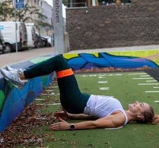 BRIDGE Træner: Baller og baglår. Instruktion: Læg dig på ryggen med fødderne på kanten af en sofa eller bænk og armene langs siden. Placer en elastik omkring knæene. Løft hoften op, hold spændingen i et sekund, og sænk langsomt tilbage.
