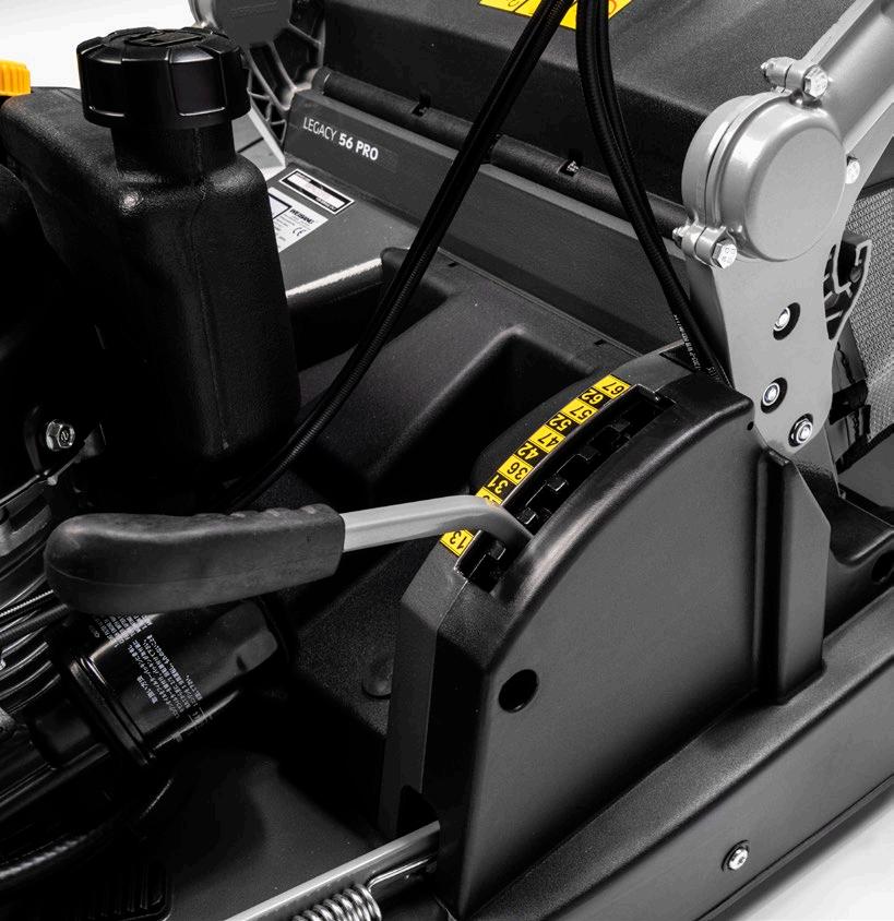 The central height adjustment is supported by a heavy duty foot pedal to raise the cutter deck. With a choice of 10 positions from 15mm for a tidy formal finish and up to 115mm for longer areas.