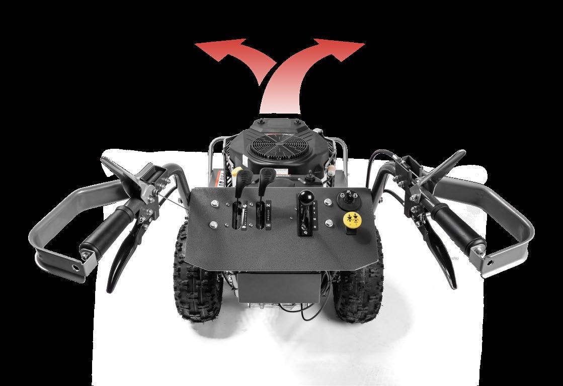 The 68 TFP features a wide 68cm cutting width and E-drive. Featuring a hybrid power system utilising the WEIBANG XC400H engine and twin wheel motors to drive the tracks and offer zeroturn capability. The machine can be used as a walk behind or stand-on mower, or remotely with the optional remote control kit.