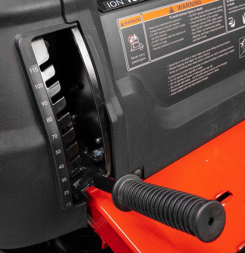 The iON zero turn mower features fully adjustable seating positions. Similar to that in a car, simply pull the lever under the seat and slide forwards or backwards to the desired position. The seat has a high back design and the addition of arm supports and a seat belt for comfort and safety.