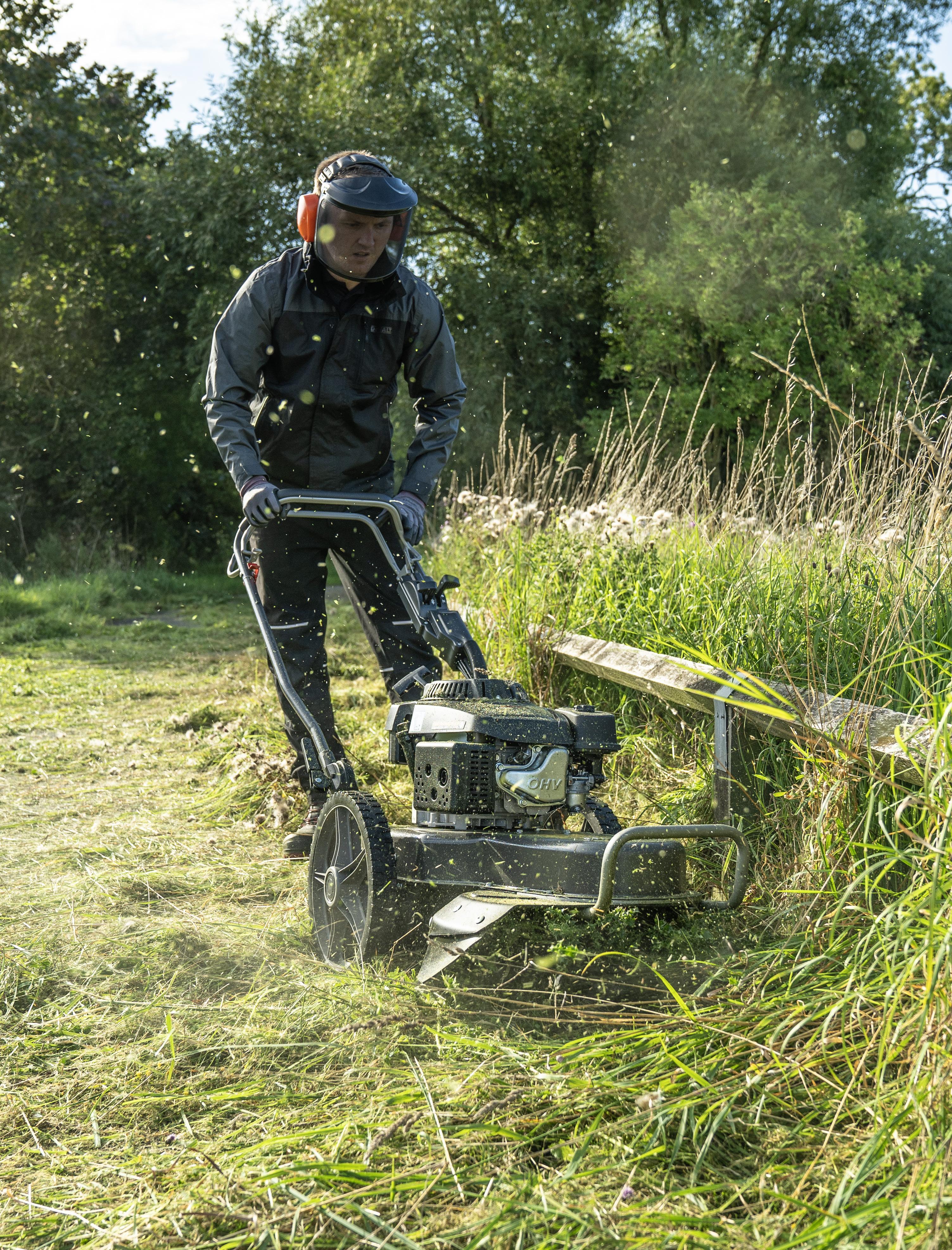 The Velocity 68 TFP offers unrivalled versatility, with the ability to be used in 3 modes. Use the machine as a traditional walk-behind flail, or as a stand-on mower thanks to the foldaway standing platform when tackling tougher terrain. The optional remote control kit allows the machine to be controlled remotely by the operator where conditions do not allow an operator presence such as steep banks.