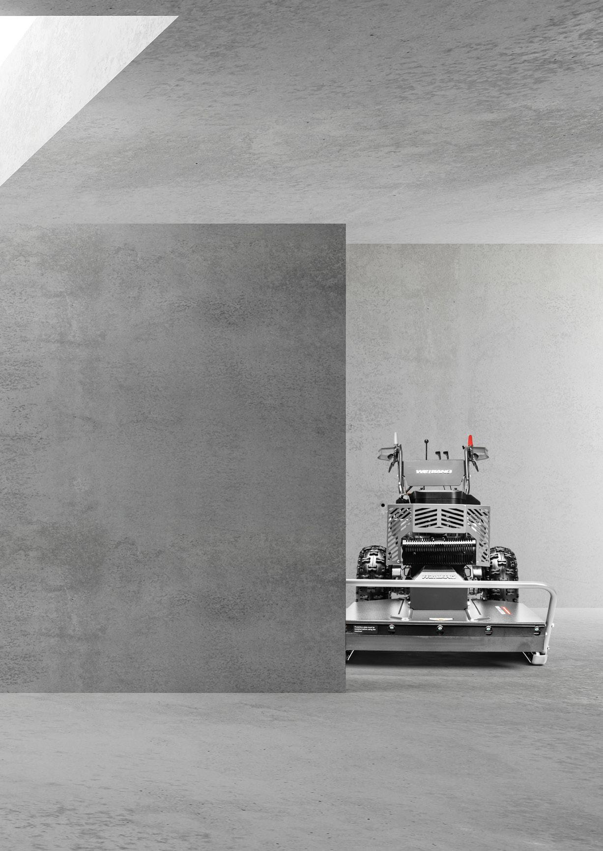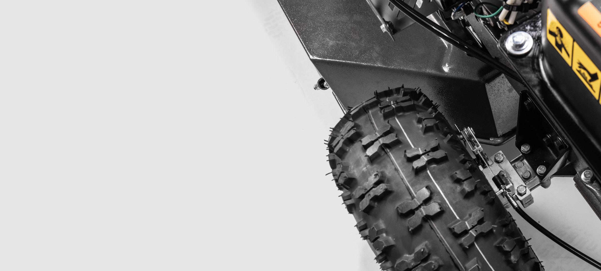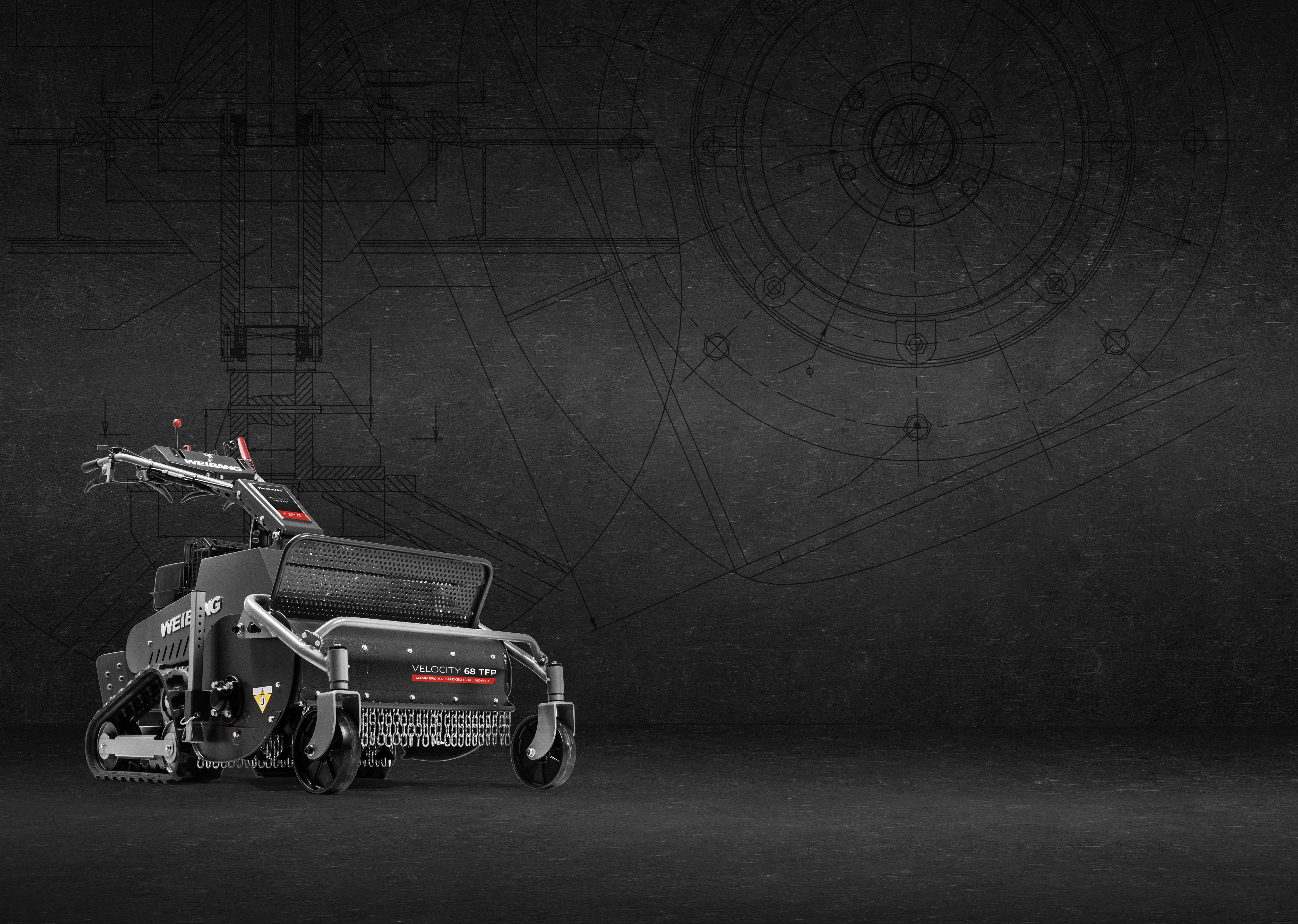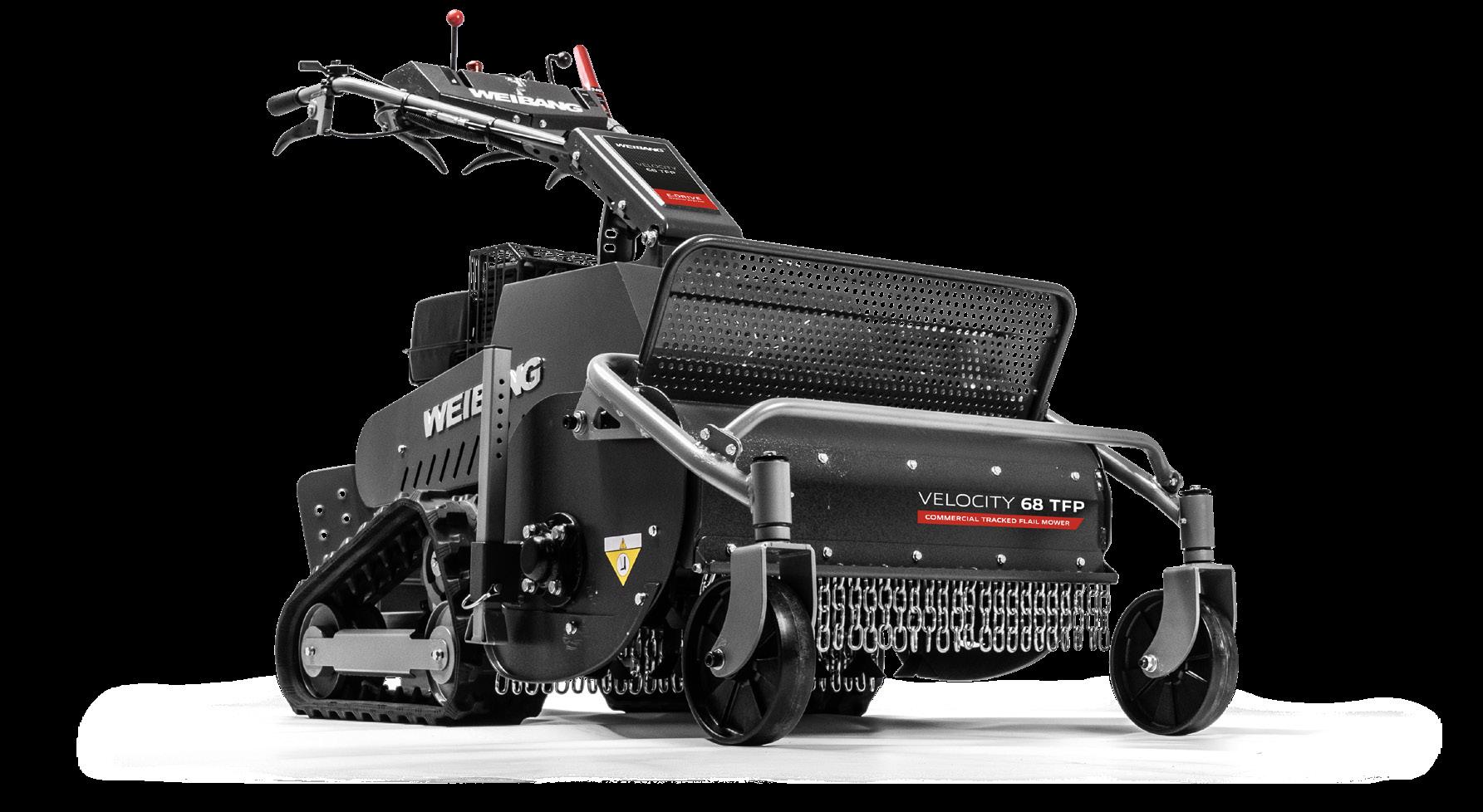 The 68 TFP features a wide 68cm cutting width and E-drive. Featuring a hybrid power system utilising the WEIBANG XC400H engine and twin wheel motors to drive the tracks and offer zeroturn capability. The machine can be used as a walk behind or stand-on mower, or remotely with the optional remote control kit.