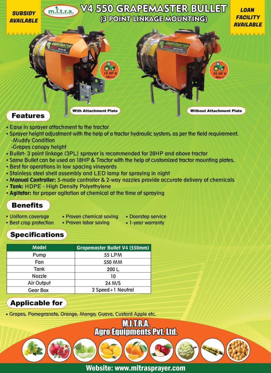 – Mitra Bullet | Mitra Grapemaster Bullet Classic | Mitra Grapemaster Eco | Mitra Airotec Turbo 600 & Mitra Airotec Turbo 800 are examples of specially engineered vineyard sprayer for your grape farms.