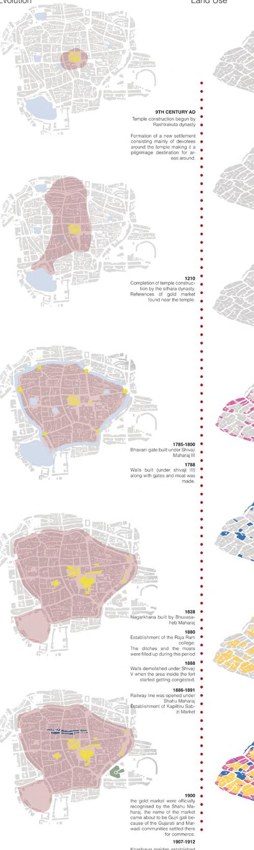 The inner core of Kolhapur, which is also its historic core from where the city first started out, consists of old public buildings, palaces and wadas that form the cultural fabric of the city. On account of the heavy footfall of tourists and pilgrims into this area of the city each month, shops started coming up on the ground floors and on the main wide roads while residential units started shifting to the peripheries and the inner, smaller lanes of the inner core. The area then started getting rapidly commercialised. These factors make this part the most bustling part of the town.