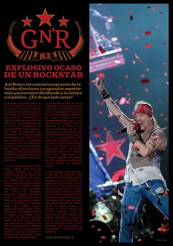 DE UN ROCKSTAR Axl Rose y los nuevos integrantes de la banda ofrecieron un agotador espectáculo que terminó dividiendo a la crítica y el público. ¿Tú de qué lado estás? La antesala a la presentación de Guns ´N Roses en Lima fue tan larga como engorrosa y delirante. Se anuncia el concierto, los fanáticos locales se dividen entre los que extrañan visceralmente a Slash y aquellos que se conforman con ver en vivo al legendario Axl, se anuncia la presentación de Jane’s Addiction como ‘telonero’, Axl insulta al organizador del espectáculo en Twitter, se cancela la presentación de Perry Farrell y sus compinches, el empresario dice que Axl viene de todas maneras pese a los Fuck Alberto Menacho! y demás ‘twiteos’ belicosos, se anuncia ahora la presencia del ex Skid Row Sebastian Bach en el recital de la Explanada del Monumental, etc… Y eso fue solo el principio. Porque luego, cuando Guns inició su conflictivo itinerario por Latinoamérica, todo se puso todavía más incierto y peliagudo, casi aterrador: retrasos de cuatro o cinco horas, peleas de los seguidores de la banda con la policía, vandalismo, botellazos, fuego, apocalípticas crónicas de periodistas indignados, ‘bloggers’ iracundos, en fin… Lo cierto es que, pese a todo, las entradas para el concierto en Lima seguían vendiéndose como pan caliente. ¿Cómo explicar eso? Muy simple. Gordo, disforzado, con la garganta hecha un huaipe y los modales de un ‘bouncer’ con altísimo grado de estrés, Axl Rose sigue teniendo ese magnetismo irresistible que hechizó al planeta en los distantes años de gloria de una banda que redefinió casi por completo el concepto de ‘pasarla bien’ sobre los escenarios (y lejos de ellos).