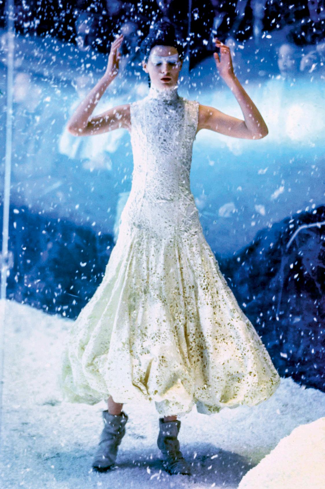 It is often in the cold that fashion unfolds its most enchanting visions, turning the season into a stage for wonder. In 1999, Alexander McQueen transported audiences into an otherworldly winter scene: a glass snow globe-like pavilion containing a birch forest covered with 25 tons of artificial snow, where models walked on a powdered floor. Inspired by Stanley Kubrick’s The Shining, the show evoked the haunted beauty of the Overlook Hotel: isolation, mystery, the unsettling purity of infinite white. McQueen transformed snow into poetic language, a gothic fairy tale or fable, in which aesthetics, emotion, and artifice merged to create fashion myth. The show ended in a rare standing ovation.