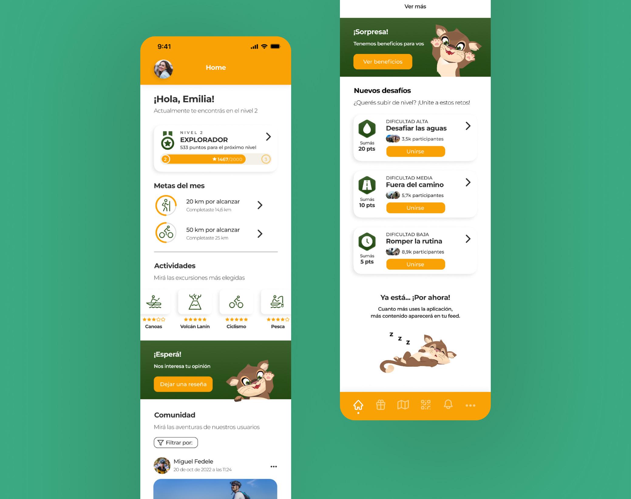 Home de la app, cuenta con el perfil, nivel, metas, desafíos y una comunidad.