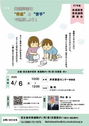 4 月 2 日は国連の定めた世界自閉症啓発デー、4 月2~ 8 日は発達 障害啓発週間です。宮古島市では、皆さんに広く発達障がいに ついて知ってもらうため、臨床心理士の内山 敏 先生を講師 に お迎えし、講演会を実施します。内山先生は医療現場、発達障害 者支援センター所長、現在は大学の准教授と幅広い分野で発達障 がい児・者の支援をしてこられました。子どもの発達が気になる方、 職場や友人との付き合い方で悩んでおられる方、周囲に気になる 人はいないけど発達障がいに興味のある方、みんな大歓迎ですので、 是非お越しください。