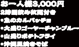 お一人様 生ビールあり 3,200円(室料込) 生ビールなし 2,800円(室料込)