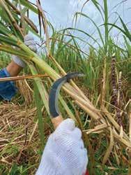 宮古島では、1月~3月中旬、長くなれば4月に入るまでさとうきびの収穫の時期と なります。数十年前は家族総出でキビ刈りを手伝うのが宮古島の冬の風物詩 でした。現在は収穫のほとんどがハーベスターを使った収穫となっていますので 宮古島出身の方でもさとうきびを収穫したことがない、という方が増えています。 少し寂しい気もしますが、さとうきびの収穫は重労働ですので手刈りで収穫する のはとても大変です。今回はさとうきびの収穫に使用する道具、流れを簡単に ご紹介します。※農家によって多少やり方が違います。