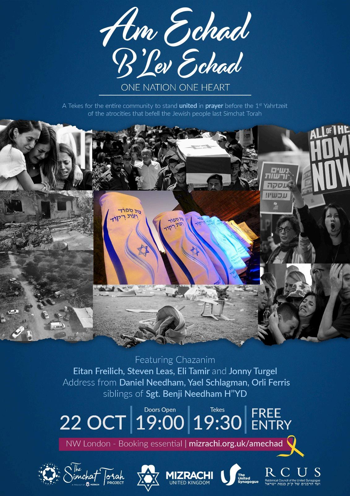 That is why we are holding, along with the United Synagogue and the RCUS a very special evening AM ECHAD B’LEV ECHAD – One nation with one heart, to bring the community together, with their Me’ilim, for an evening of prayer, song and unity