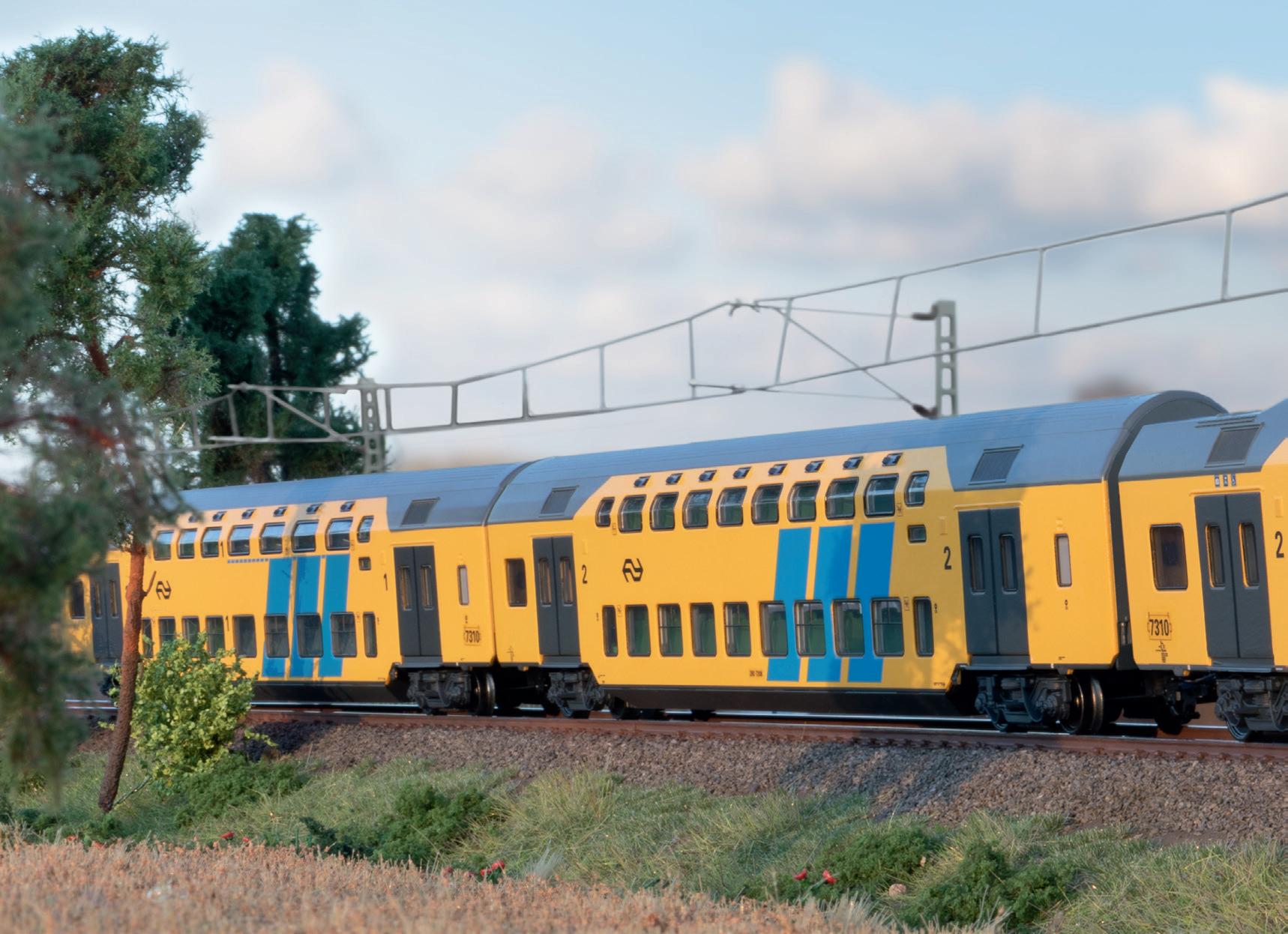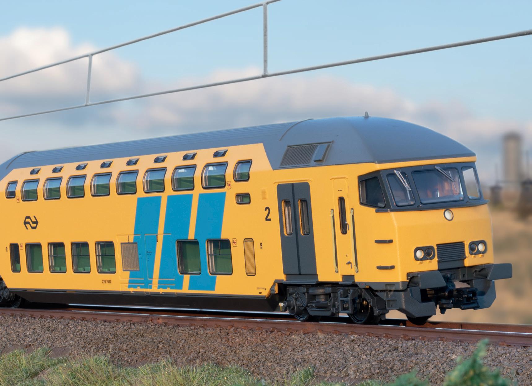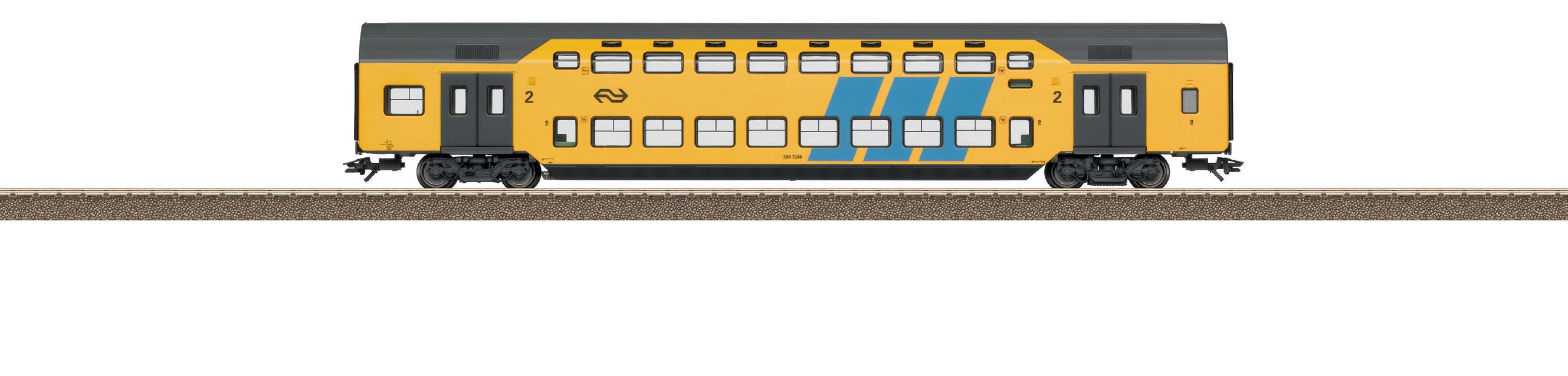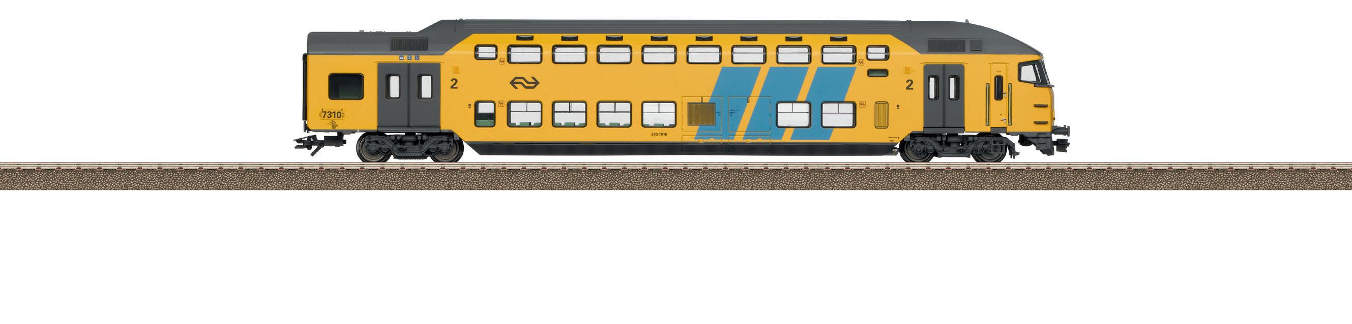 Prototype: Dutch State Railways / Nederlandse Spoorwegen (NS) type DDM2/3-Bvk, bi-level cab control car, 2nd class. Car number 270 7010. Signal yellow basic paint scheme. The car looks as it did starting in 1992. Model: Triple headlights and dual red marker lights change over with the direction of travel. Maintenance-free LEDs are used for the lighting. There is a detailed buffer beam with separately applied streamlining and an imitation automatic coupler. The cab has interior details. The underbody and skirting are speci c to the type of car. The minimum radius for operation is 360 mm / 14-3/16“. 7319 current-conducting couplings or 72020/72021 current-conducting couplers as well as 73400/73401 (3 each) LED interior lighting can be installed in the car. Length over the buffers approximately 28.2 cm / 11-1/8”.
