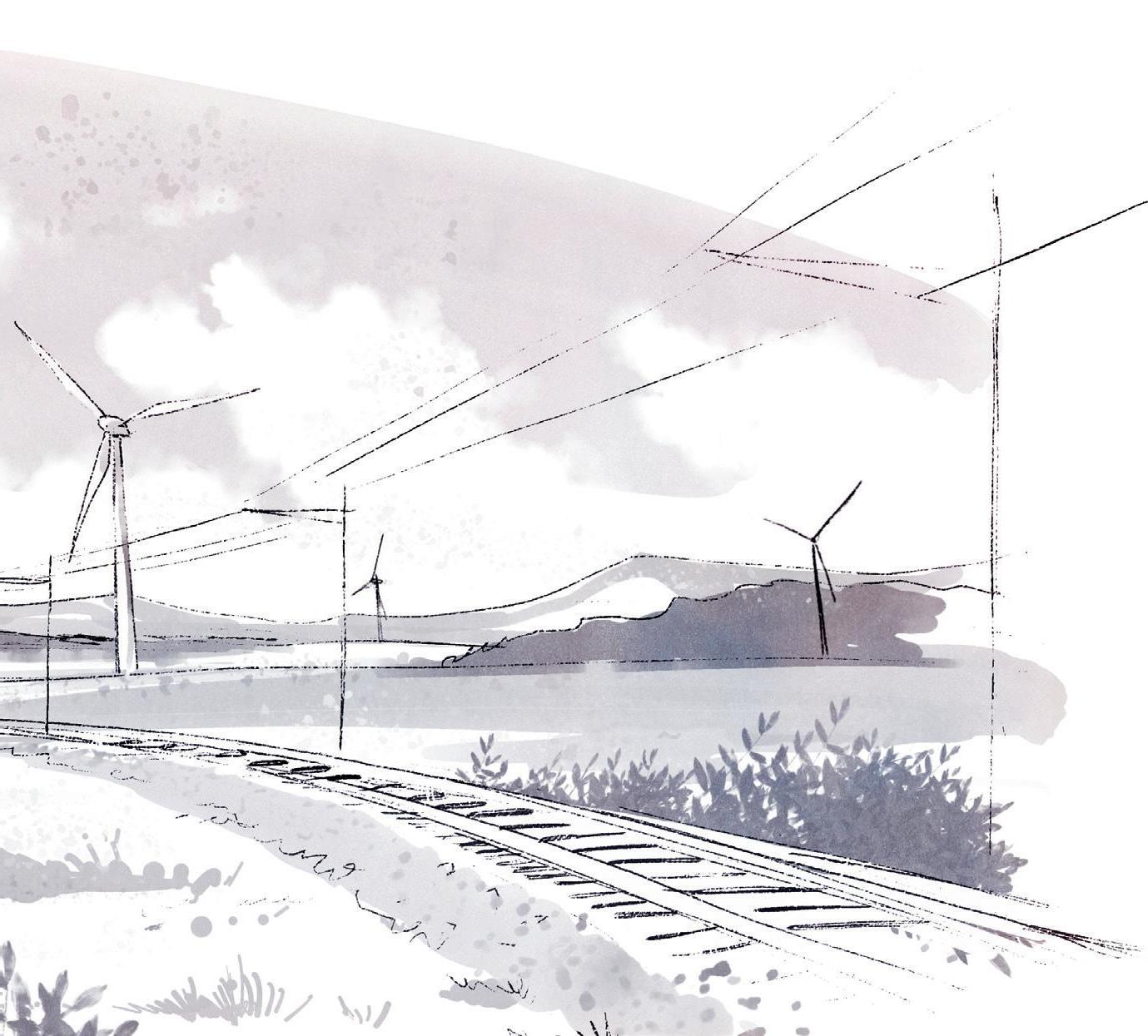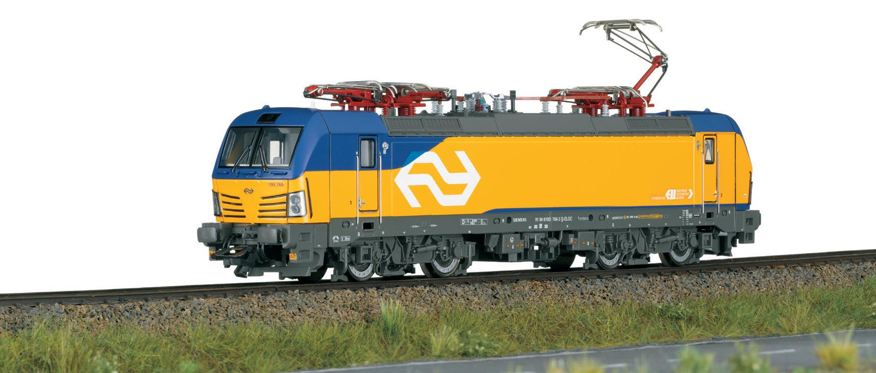 Prototype: European Locomotive Leasing (ELL) class 193 (Vectron) electric locomotive, leased to the Dutch State Railroad (NS). Road number 193 . The locomotive looks as it did in 2021. Model: The locomotive has a digital decoder and extensive sound functions. It also has controlled high-ef ciency propulsion. 4 axles powered. Traction tires. The triple headlights and dual red marker lights change over with the direction of travel, will work in conventional operation, and can be controlled digitally. Long-distance headlights can be controlled separately. The cab lighting can be controlled digitally. The control desk lighting can be controlled digitally. The headlights at Locomotive Ends 2 and 1 can be turned off separately in digital operation. When the headlights are off at both ends, the double “A” lights are on at both ends. Maintenance-free warm white and red LEDs are used for the lighting. Length over the buffers 21.8 cm / 8-9/16“.