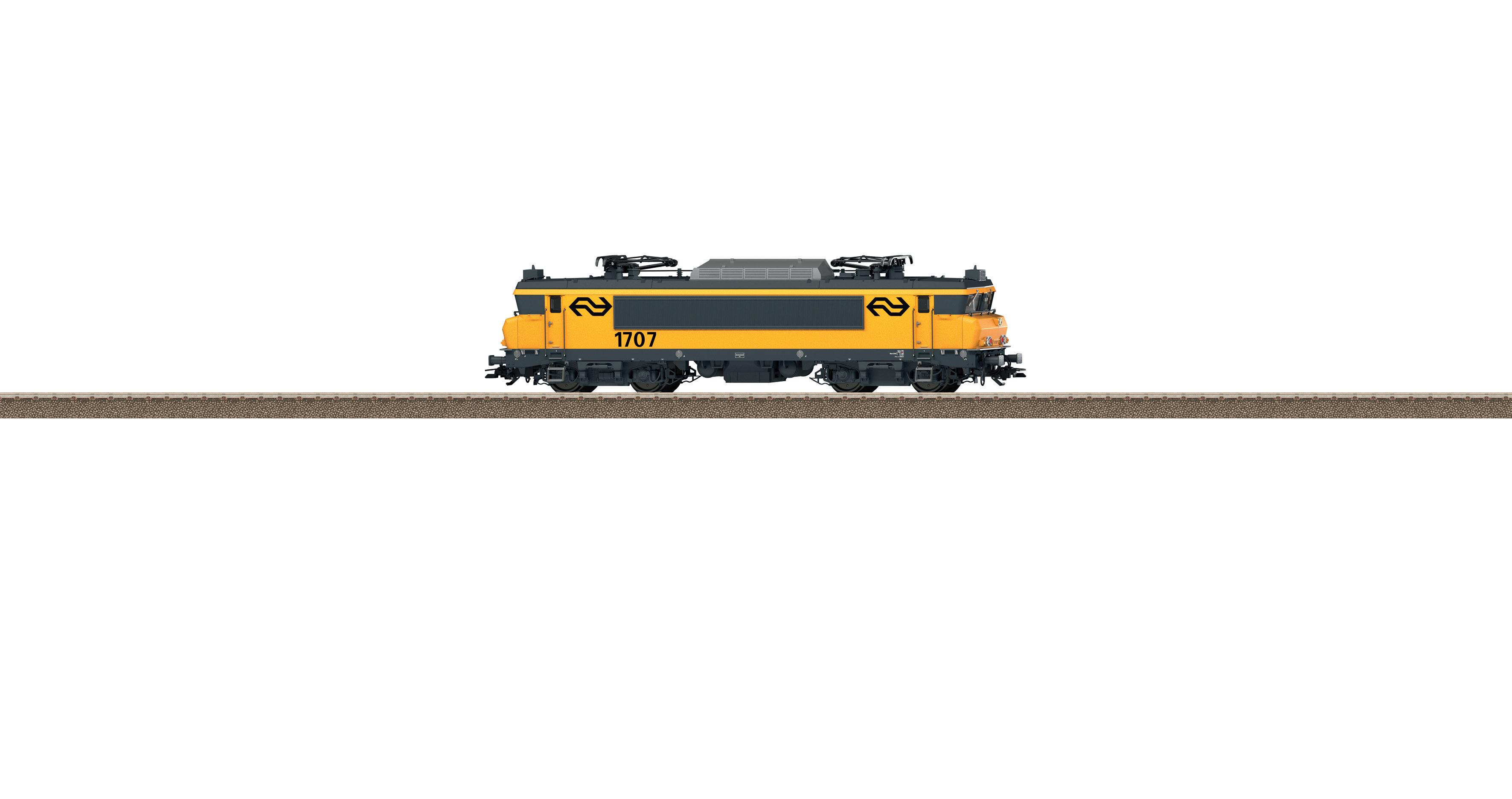 Prototype: Dutch State Railways / Nederlandse Spoorwegen (NS) class 1700 electric locomotive. Locomotive road number 1707. Signal yellow basic paint scheme. The locomotive looks as it did starting in 1992. Model: The locomotive has an mfx digital decoder and extensive sound functions. It also has controlled highef ciency propulsion with a ywheel, centrally mounted. All four axles powered using cardan shafts. Traction tires. The triple headlights and dual red marker lights change over with the direction of travel, will work in conventional operation, and can be controlled digitally. The headlights at Locomotive Ends 2 and 1 can be turned off separately in digital operation. Additional light functions such as various switching lights and warning lights can be controlled separately. Cab lighting can be controlled digitally. Maintenance-free warm white and red LEDs are used for the lighting. The pantographs can be raised and lowered digitally. The locomotive has separately applied windshield wipers, ventilation grills, grab irons, and roof conductors. The buffer height is according to NEM standards. Brake lines and imitations of an automatic coupler are included as separate parts to be mounted on the locomotive. Length over the buffers approximately 20.3 cm / 8“.