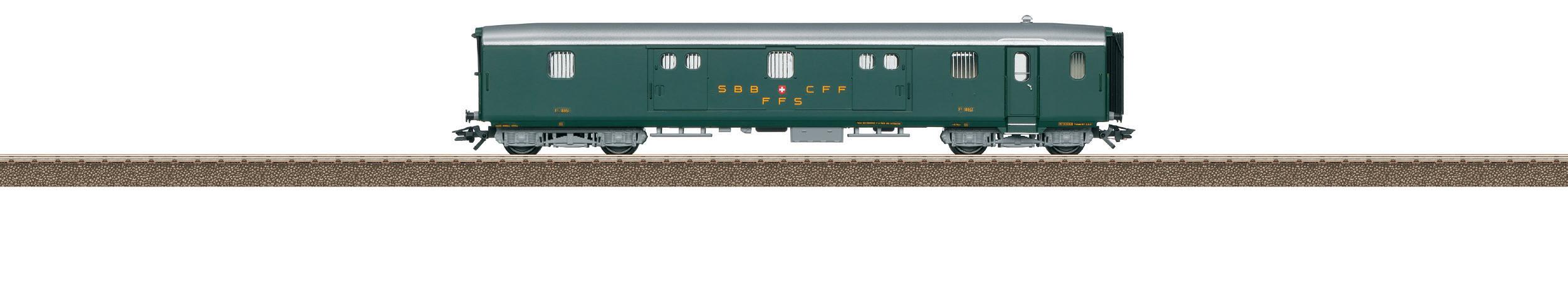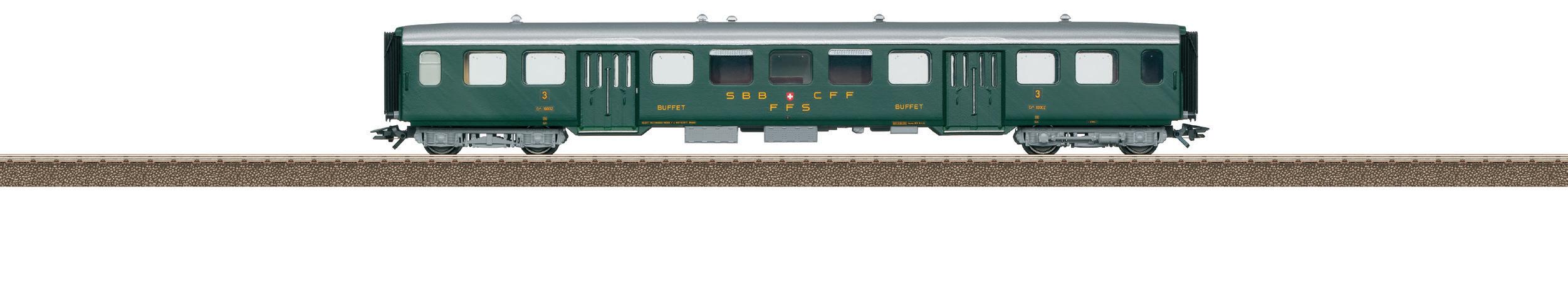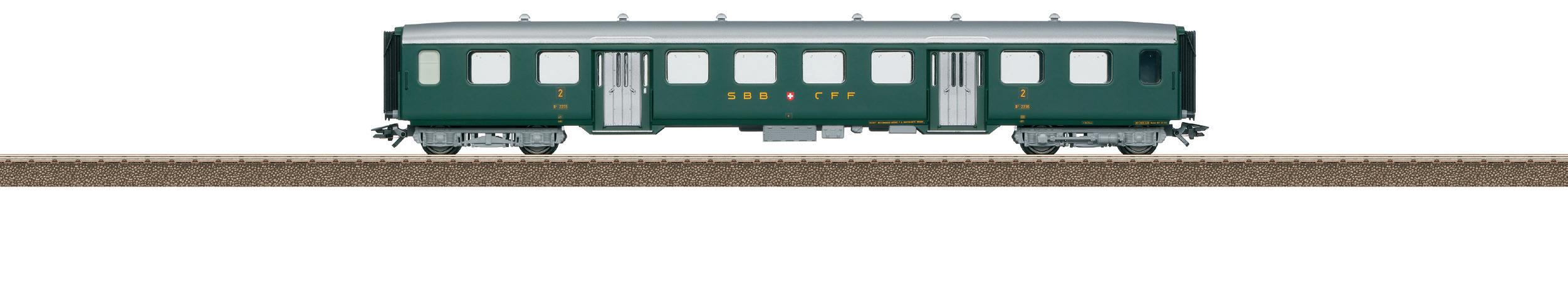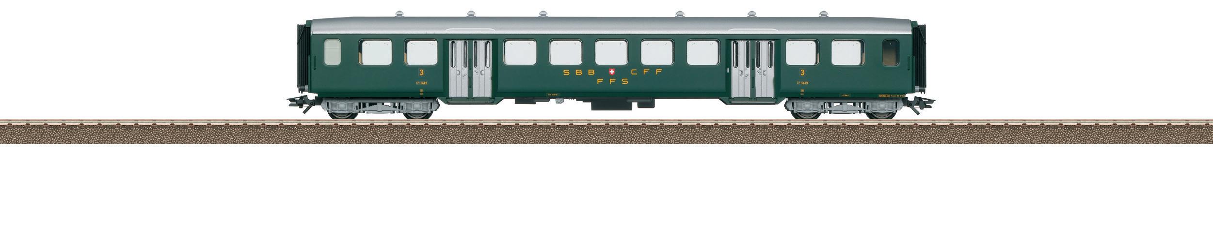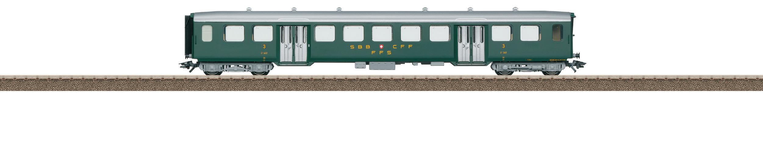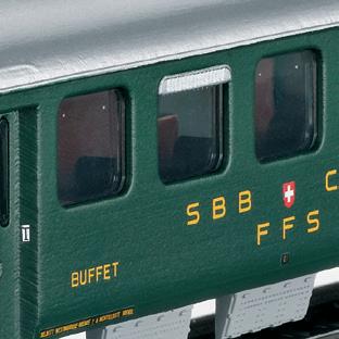 Prototype: 5 various Swiss Federal Railways (SBB) lightweight steel cars of different types. 2 type C4 lightweight steel cars, 3rd class. 1 type B4 lightweight steel car, 2nd class. 1 type Cr4 lightweight steel car, 3rd class with a buffet area. 1 type F4 lightweight steel baggage car. For use in lightweight trains on at terrain on the route Geneva-Bern-Zürich. All of the cars in r green basic paint scheme. The cars look as they did around 1950. Model: The minimum radius for operation is 360 mm / 14-3/16“. All of the cars have factory-installed interior lighting with warm white LEDs. Extended diaphragms are included to replace the retracted diaphragms at the ends of the car consist. Total length over the buffers 126 cm / 49-5/8”.