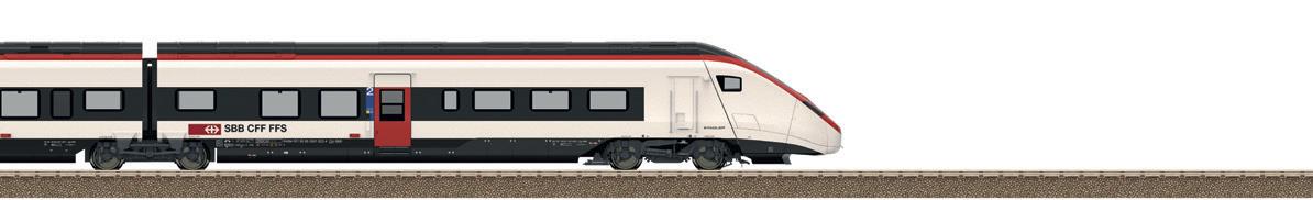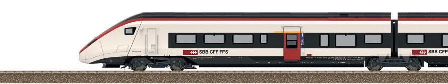 Prototype: Swiss Federal Railways (SBB) EC 250 electric high-speed rail car train as the class RABe 501 “Giruno”. 1 type A (Bt1) end car, 2nd class. 1 type F (B7) intermediate car, 2nd class, with handicapped entries and a pantograph. 1 type G (WR6) intermediate car, with a dining area. 1 type H (A5) intermediate car, 1st class, with handicapped entries and a pantograph. 1 type L (At2) end car, 1st class. In use as a multi-system powered rail car train between the Zürich Airport and Basle as well as across the Alps through the Gotthard Basis Tunnel to Milan. Permission planned for use in Germany and Austria. The train looks as it did in 2021. Model: This is a 5-part basic set. The dining car G and the two intermediate cars F and H arranged on the left and right are coupled permanently to each other with Jakobs trucks. The train has a digital decoder and extensive sound and light functions. It also has controlled, high-ef ciency propulsion with a ywheel, centrally mounted in the dining car. All 4 axles in both Jakobs trucks on the left and right of the dining car are powered using cardan shafts. Traction tires. The cabs in the end cars have interior details. Current pickup is done from the end car at the front of the train and changes with the direction of travel. There is a guide mechanism in the Jakobs trucks. Triple headlights and dual red marker lights change over with the direction of travel, will work in conventional operation, and can be controlled digitally. The train can be switched to a white marker light (Swiss headlight / marker light code). There are additional separately controlled light functions. The train has factory-installed interior lighting. The interior lighting is supplied with power from a continuous electrical connection throughout the entire train. The cab and control desk lighting are also each controlled separately in digital operation. Maintenance-free warm white and red LEDs are used for all of the lighting. The pantographs on the F and H intermediate cars can each be raised and lowered separately as a digital function. The train is modelled true-to-scale. The minimum radius for operation is 360 mm / 14-3/16“. Length of the basic set approximately 112 cm / 44-1/8”.