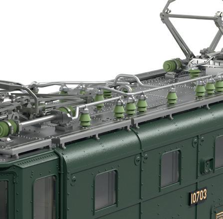 room are modelled. The roof equipment is detailed with roof conductors, insulators, and roof catwalks as well as double arm pantographs. The minimum radius for operation is 360 mm / 14-3/16“. Brake hoses and imitation prototype couplers are included. Length over the buffers 16.9 cm / 6-5/8”.