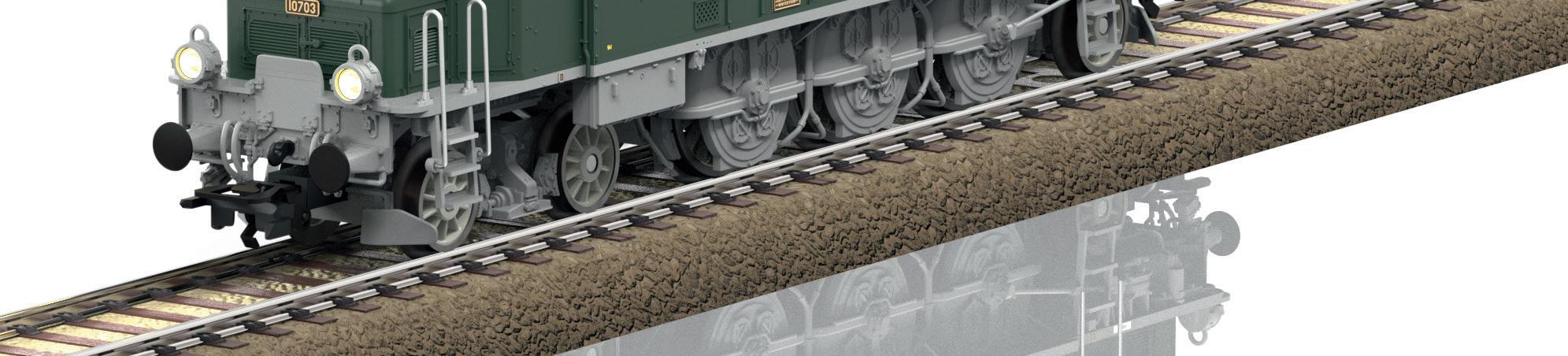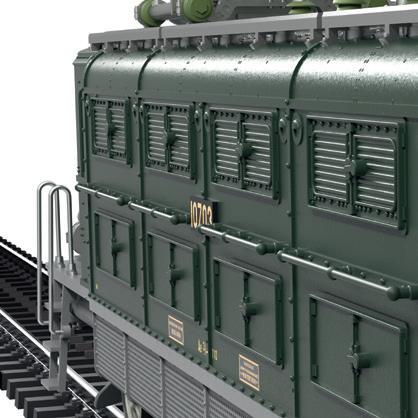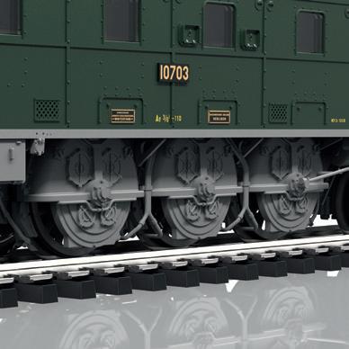 Prototype: Swiss Federal Railways (SBB) class Ae 3/6 I electric locomotive. Locomotive from the eighth production run. Fir green paint scheme with gray running gear. With older style buffers, end walkover plates, and 4 cab doors on the sides. Oncoming train light above each of the upper lamps. Locomotive for use pulling lightweight express trains on at terrain, on the route Geneva-Bern-Zürich. Locomotive road number 10703. The locomotive looks as it did at the beginning of Fifties. Model: The locomotive has a digital decoder and extensive sound and light functions. It also has controlled high-ef ciency propulsion with a ywheel. All 3 driving wheelsets powered. Traction tires. The triple headlights and one white marker light (Swiss headlight code) change over with the direction of travel, will work in conventional operation, and can be controlled digitally. The lighting can be switched to a red marker light when the locomotive is running “light”. The oncoming train light can be controlled separately in digital operation. The headlights at Locomotive Ends 2 and 1 can be turned off separately in digital operation. When the headlights are off at both ends, the double “A” light function is on at both ends. There is also cab lighting and engine room lighting, which can each be controlled separately in digital operation. Maintenance-free warm white and red LEDs are used for the lighting. The locomotive has highly detailed metal construction with many separately applied details such as cooling pipes for transformer oil. The cabs and engine