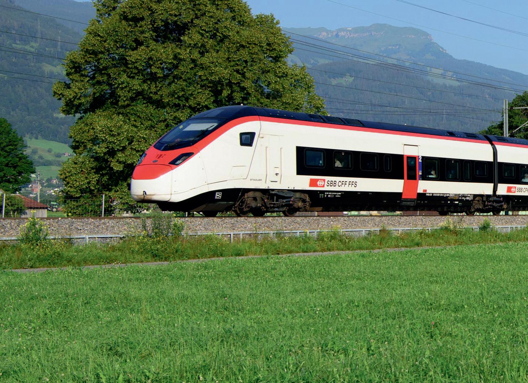 When the Gotthard Basis Tunnel was placed into service, the Swiss Federal Railways (SBB) announced internationally in the spring of 2012 the delivery of powered rail car trains with a maximum speed of 250 km/h / 156 mph. Eventually, the Swiss firm Stadler prevailed in April of 2014 with their concept SMILE (Schneller Mehrsystemfähiger Innovativer Leichter Expresszug / Fast Multisystem Innovative Lightweight Express Train), whereby Stadler built a high-speed train for the first time. The SBB ordered 29 eleven-part units of the new class RABe 501 for international service and assigned them the designation “Giruno” (derived from Rhaeto-Romanic “girùn” for “Buzzard”). The trains can run in four countries under three current systems (15 kilovolts / 16.7 Hertz; 25 kilovolts / 50 Hertz, and 3 kilovolts DC) and are equipped with the ETCS, PZB, LZB, and SCMT train safety systems for this. The “Giruno” is a 202 meter / 656 foot 6 inch long, single-level operationally permanent multi-unit train with Jakobs trucks. Only the end cars have normal trucks under their outer ends. Four Jakobs trucks are powered with three-phase, asynchronous motors, whereby the propulsion equipment is designed to be redundant with four traction rectifiers. An eleven-part class RABe 501 consists of four cars, 1st class, with 117 seats mostly in a 2+1 arrangement, a dining car, as well as six cars, 2nd class, with 288 seats in a 2+2- arrangement. The dining car as well as the two adjoining cars are constructed to meet handicapped requirements in order to satisfy the provisions of the Swiss handicapped access law. The “Giruno” has step-less entries for station platform heights of 55 cm / 22“ and 76 cm / 30”. Its pressure-resistant and air conditioned passenger areas and cab as well as the multifunction compartments and bicycle compartments in the passenger area set a new standard for comfortable travel by train. All of the passengers have a free view of the screens for the digital information system. In addition, cell phone signal boosters and WLAN are available in both classes. On May 10, 2021, the SBB took delivery of the last 29 trains. Since then they have TSI permission as well as network permission for Switzerland, Germany, Italy, and Austria. Since December of 2019, they have run on regular schedules through the Gotthard Basis Tunnel and they connect Basle/Zürich with Chiasso and Lugano. Continuing runs to Italy to Milan started on August 12, 2020, since September in multiple unit operation too. In the next step, runs between Basle and Frankfurt/Main are planned. Also being considered by the SBB is the use of these new powered rail car trains in the direction of Hamburg.