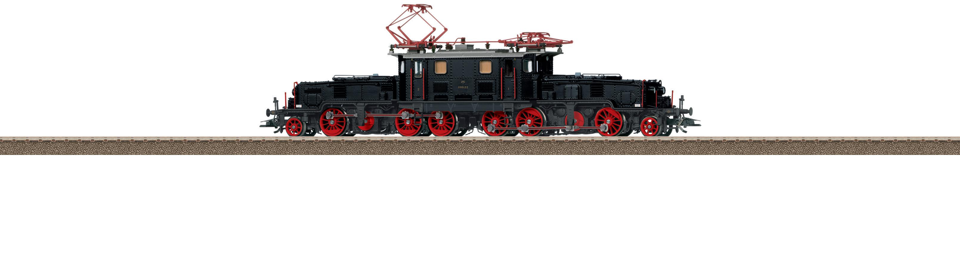 Prototype: Class 1189 “Austrian Crocodile” electric locomotive. Fictitious version in a black basic paint scheme. Road number 1189.22. The locomotive looks as it did at the beginning to mid-Seventies. Model: The locomotive has an mfx digital decoder and extensive sound and light functions. It also has controlled high-ef ciency propulsion with a ywheel, centrally mounted. Two each driving wheels in both driving frames are powered using cardan shafts. Traction tires. The locomotive has articulated running gear to enable it to negotiate curves. The triple headlights and a red marker light change over with the direction of travel, will work in conventional operation, and can be controlled digitally. The lighting can be changed to a white marker light. The headlights at Locomotive Ends 2 and 1 can be turned off separately in digital operation. When the headlights are off at both ends, the switching light is on (1 each white at both ends of the locomotive). The cab and engine room lighting can be controlled separately in digital operation. Maintenance-free, warm white and red LEDs are used for the lighting. The locomotive has highly detailed metal construction with many separately applied details, such as cooling pipes for the transformer oil. The cabs and engine room have interior details. The locomotive has detailed roof equipment. The minimum radius for operation is 360 mm / 14-3/16“. Brake hoses and imitation prototype couplers are included. Length over the buffers approximately 23.4 cm / 9-3/16”.