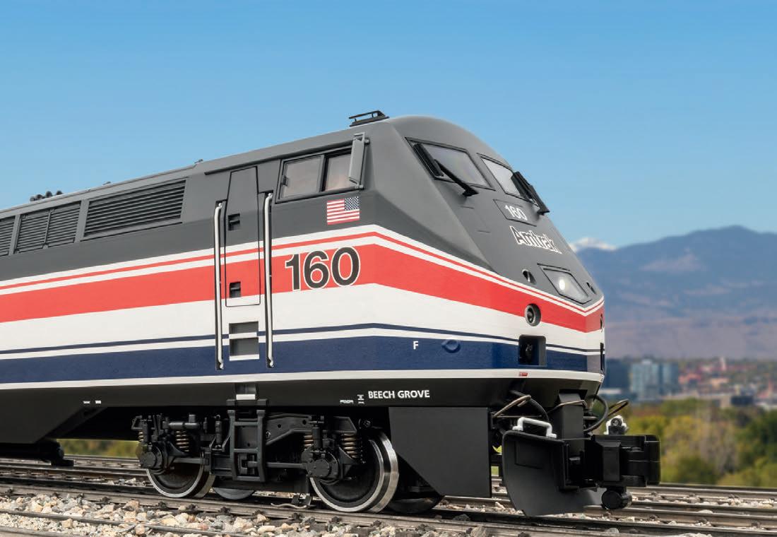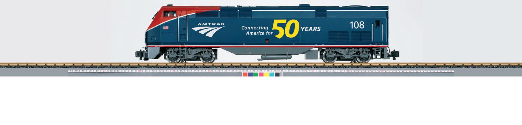 Produced by LGB / Märklin for the first timeThis is a model of the AMD 103 “Genesis” diesel locomotive for the American passenger service company Amtrak. The paint scheme and lettering on road number 160 are an adaptation of the Phase III scheme as applied to Amtrak’s Dash 832BWH locomotives to celebrate the 50th anniversary of Amtrak. All four wheelsets are driven by two powerful Bühler ball bearing motors. The locomotive has an mfx/DCC decoder with many light and sound functions. There is cab lighting and instrument lighting, which can be controlled in digital operation. The locomotive comes with American knuckle couplers installed and LGB system couplers are included. Length 77 cm / 305/16”.