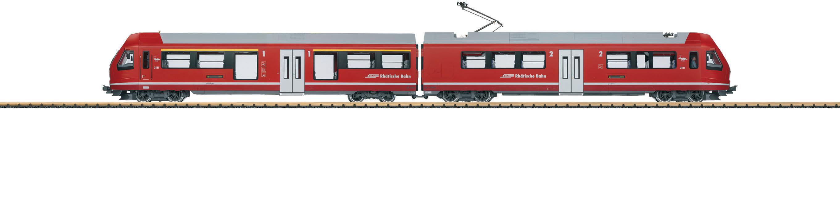This is a model of the RhB class Abe 4/16 “Capricorn” powered rail car and control car. The paint scheme and lettering are prototypical for Era VI. Four wheelsets are driven by two powerful ball bearing motors. Traction tires. The model has an mfx/DCC decoder with many light and sound functions such as headlights, which change over with the direction of travel, interior lighting, as well as train destination signs controllable in digital operation, and lighted coatsofarms for the Grisons. The running sounds will also work in analog operation. There are many separately applied details such as lines, plugs, windshield wipers, antennas, and rear view mirrors. Both units can be combined with the 33100 and 33150 intermediate cars to form a prototypical fourunit train. Length over the buffers 153 cm / 601/4“.