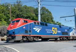 E and F units. Planning and purchase of a new locomotive designed especially for passenger service was thus begun. Yet, it took until 1992 until the first locomotives of the new generation were delivered. These locomotives built by General Electric had the class designations P40DC, P42DC, and P32ACDM, depending on the features. They were popularly known as the “Genesis”. With a motor performance between 3,200 and 4,250 horsepower – depending on the version – and a maximum speed between 166 km/h / 104 mph and 177 km/h / 111 mph, these 21 meter / 68 foot 3 inch long and approximately 125 metric ton locomotives still currently fulfill all tasks placed on them. The differences from the heavy sixaxle diesel freight locomotives can be recognized in their appearance: With a completely streamlined body, these fouraxle locomotives go very well with the express passenger cars, regardless