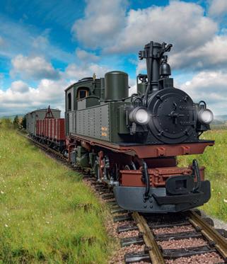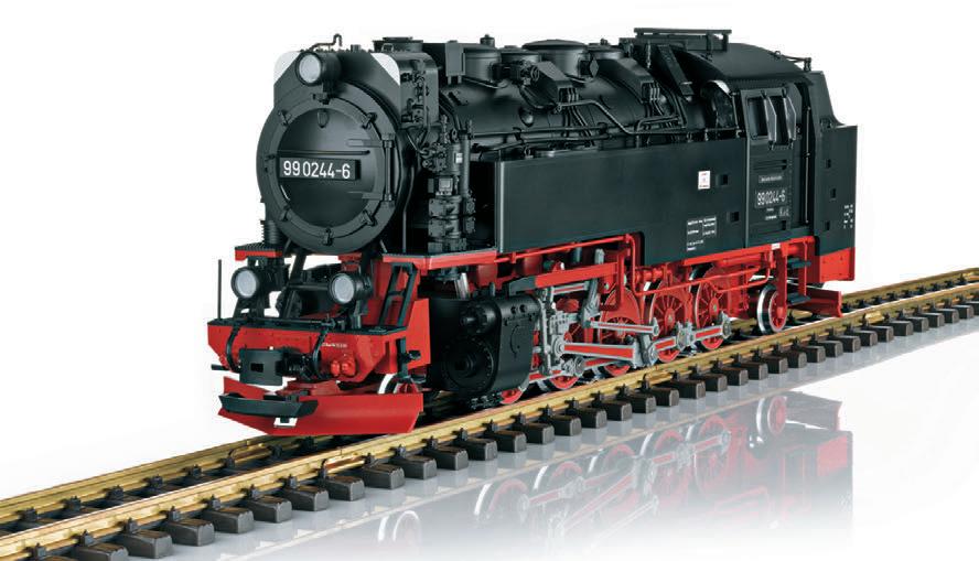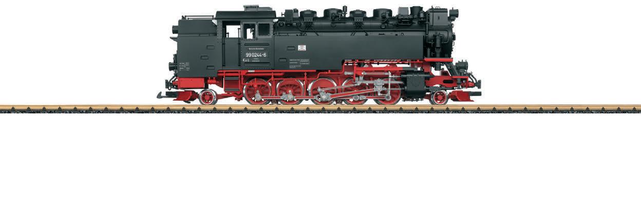 This is a model of the German State Railroad (DR) narrow gauge steam locomotive, road number 99 02446 in the version with oil firing as used in the Seventies. The paint and lettering are prototypical for Era IV. Two powerful motors with ball bearings drive all five of the wheel sets. The locomotive has an mfx/DCC decoder with many light and sound functions, such as headlights that change over with the direction of travel, cab lighting, or separately controlled running gear lights. The locomotive has a whistle and bell activated by a reed switch. These sounds will also work in analog operation. The locomotive has a builtin smoke generator with steam exhaust synchronized to the wheels as well as cylinder steam. The locomotive has many separately applied details including a completely detailed cab as well as doors that can be opened. Length over the buffers 55 cm / 215/8“.