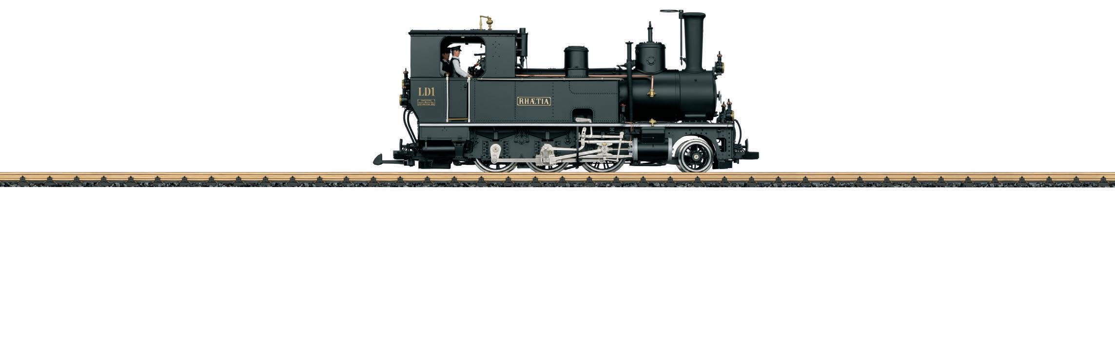 This is a model of the RhB “Rhätia” steam locomotive, the first locomotive of the Rhaetian Railroad. This is a finely detailed model in heavy metal construction with many separately applied details. All of the driving wheels are driven with side rods by a powerful motor. The cab doors and the smoke box door can be opened. The cab has complete interior details. The black paint scheme and lettering as “LD 1” are prototypical for Era I, just as the locomotive originally was in use and as is planned after the overhaul is done in 2024 and it is back in use. The locomotive has an mfx/DCC decoder with many light and sound functions such as headlights, cab lighting, running sounds, a whistle activated by a reed switch, and much more. The rear coupler can be operated by remote control