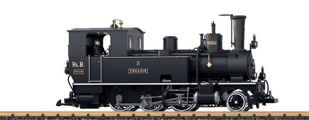 RhB. The locomotive has an mfx/DCC decoder with many light and sound functions such as headlights, cab lighting, running sounds, a whistle activated by a reed switch, and much more. The rear coupler can be operated by remote control in digital operation. The running sounds also work in analog operation. The locomotive has a builtin smoke generator with steam exhaust synchronized to the wheels, as well as cylinder steam, steam at the exhaust for the vacuum brakes, and steam exhaust at the whistle, when it is activated. Length over the buffers 35 cm / 133/4“.