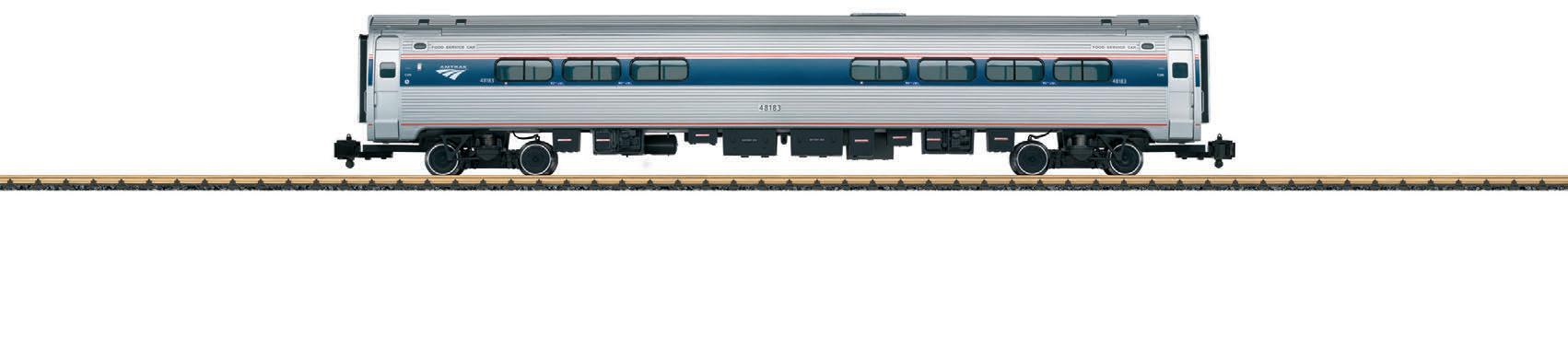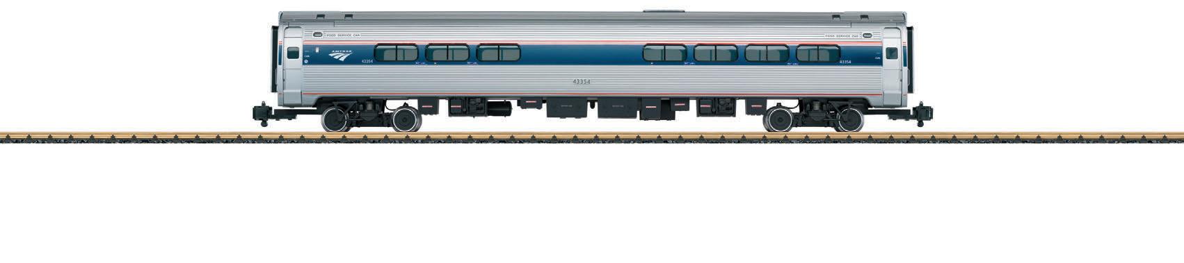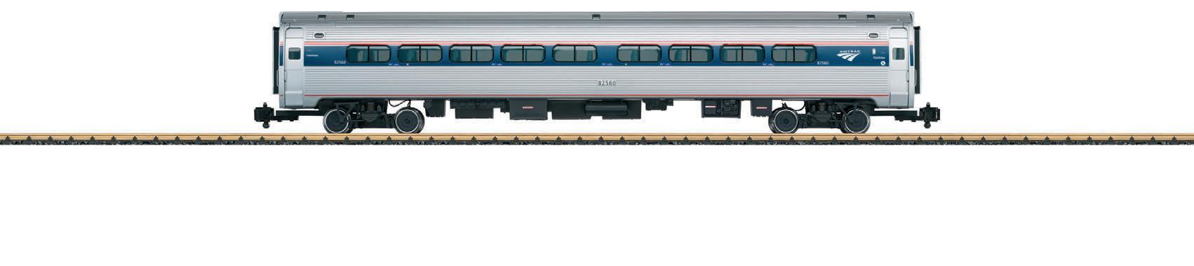 This is a model of an “Amfleet”® design passenger car for the American passenger service company Amtrak, business class version. The paint scheme and lettering are prototypical for Phase VI. The car has factoryinstalled complete interior details and lighting with LEDs. The car has metal wheelsets, 2 of them ball bearing wheelsets for current pickup. The car comes with American knuckle couplers installed and LGB system couplers are included. Length 80 cm / 311/2”.