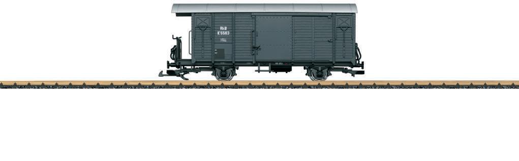 This is a model of a Rhaetian Railroad type K 1 twoaxle boxcar. The paint scheme and lettering are prototypical as an historic museum car as it still currently exists. The car has many separately applied details and sliding doors on the sides that can be opened. Length over the buffers 39 cm / 153/8“.