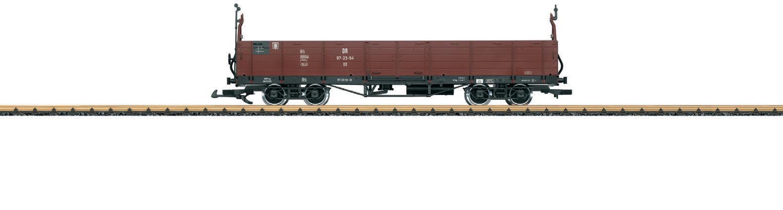 This is a model of a type OOw gondola, as it was used by the DR for a long time on the narrow gauge rail lines in Saxony. The paint scheme and lettering are prototypical for Era III. The car has metal wheelsets. Length over the buffers 48 cm / 187/8“.