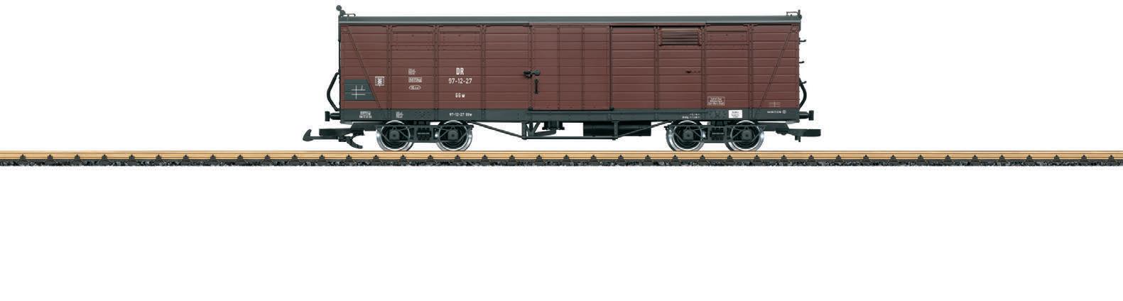 This is a model of a type GGw boxcar, as it was used by the DR for a long time on the narrow gauge rail lines in Saxony. The paint scheme and lettering are prototypical for Era III. The car has metal wheelsets. Length over the buffers 48 cm / 187/8“.