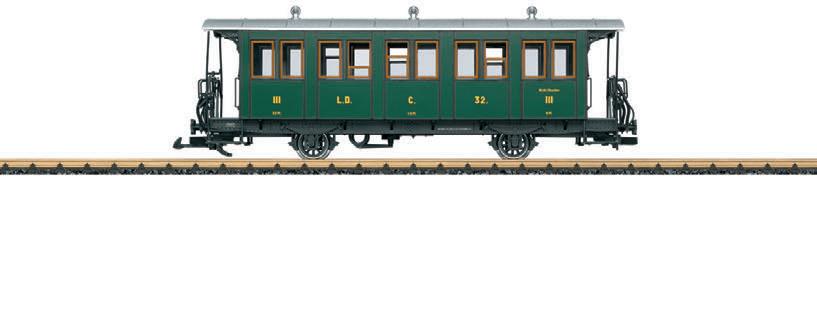 together with other historic cars. Since 2019, it has run again with its original paint scheme and its old number C 32. This is a model of an RhB passenger car, 3rd class. It is in the version of the green paint scheme of the LandquartDavos Railroad at that time, just as the car is currently in use on the RhB as a museum car. The paint and lettering are prototypical. Interior details of the car are modelled completely. Train destination signs are included. The car has metal spoked wheelsets. Length over the buffers 45 cm / 173/4“.