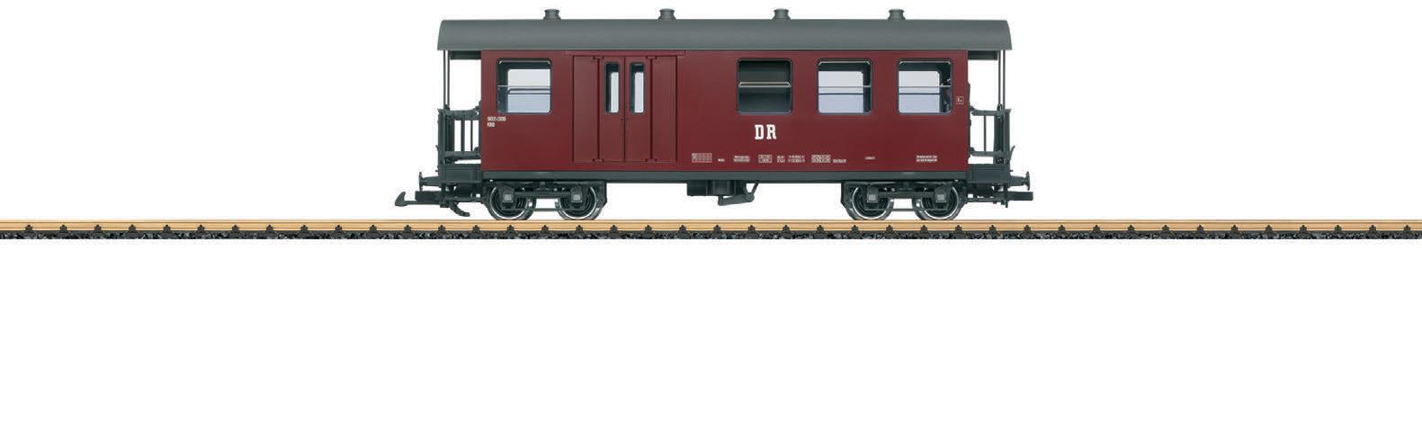 This is a model of a German State Railroad passenger car with a baggage compartment from the Harz network. The paint scheme and lettering are prototypical for Era IV. The car has many separately applied details and interior details including a toilet. The car has metal wheelsets. Length over the buffers 50 cm / 1911/16“.