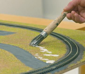 the images featured in these instructions, paint the area that you wish to scenic with the PVA wood glue mix ensuring to leave areas over which the houses and buildings will be positioned free from the material and apply the R7171 Meadow Mix to your chosen area.