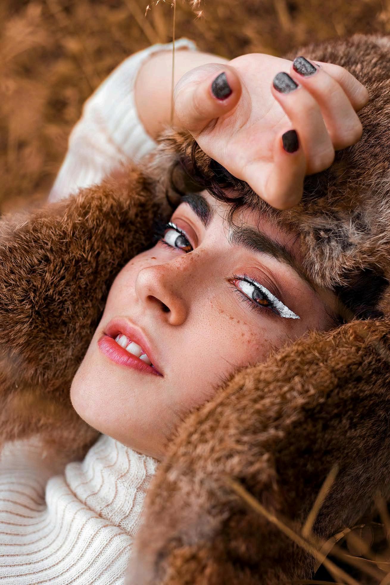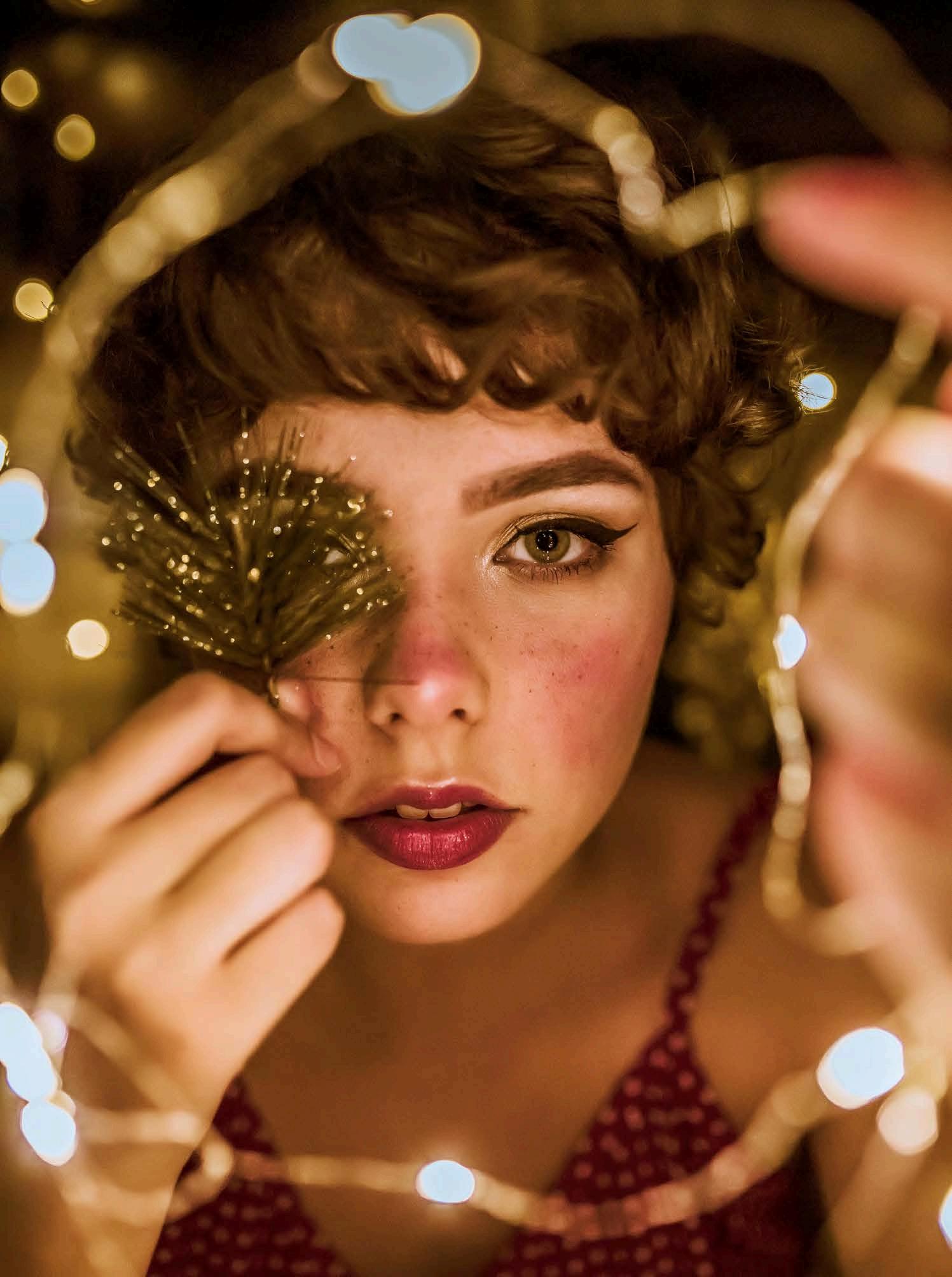 Aplicasombracobreenpárpados,blush bronceadorenmejillasylabialmarrón. Delineatuojosencolorblancoycorona estelookpintándotepecasfalsas.