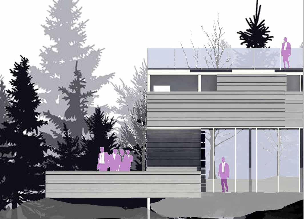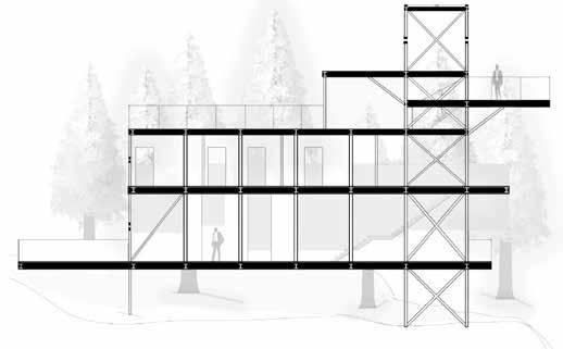 A man made object lives in nature. This man made structural element includes observation decks, private quarters for the resident scientists and a common area. It is situated in the Mt. Wilson area and it is a spaced intended for scientists to conduct research.