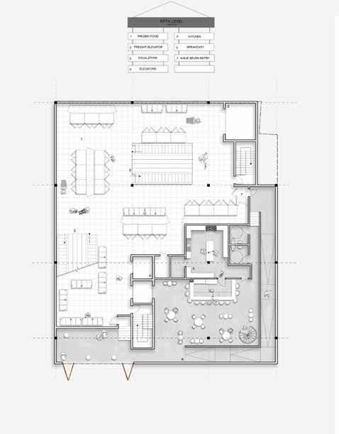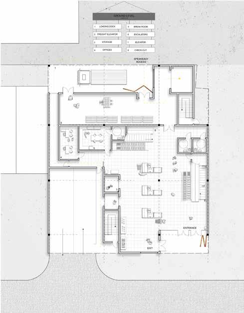 This project is a multi-level grocery store with speakeasies as an entertainment element. Co-tenants will work together to allow the grocery store to function by day and the speakeasies to function by night. This project also focuses on the element of time and transformation. Function, materiality, program, facade all transform in the project. Change is inevitable, but one can adapt to it.