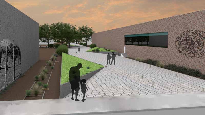 The concept for this project is the past, present, and future. Taking spaces that were once active train tracks and turning them into green spaces for the working class people of Vernon to use. A series of water features are also incorporated to treat stormwater runoff. Gardens and parks are incorporated into the design for the benefit of the community. Old train tracks peak through the ground to keep a moment in Vernon’s history alive. The land once used by trains will now become green spaces that can be used by the community of Vernon. The placement of the green interstitial spaces was chosen for possible future developments in Vernon such as the West Side Project.