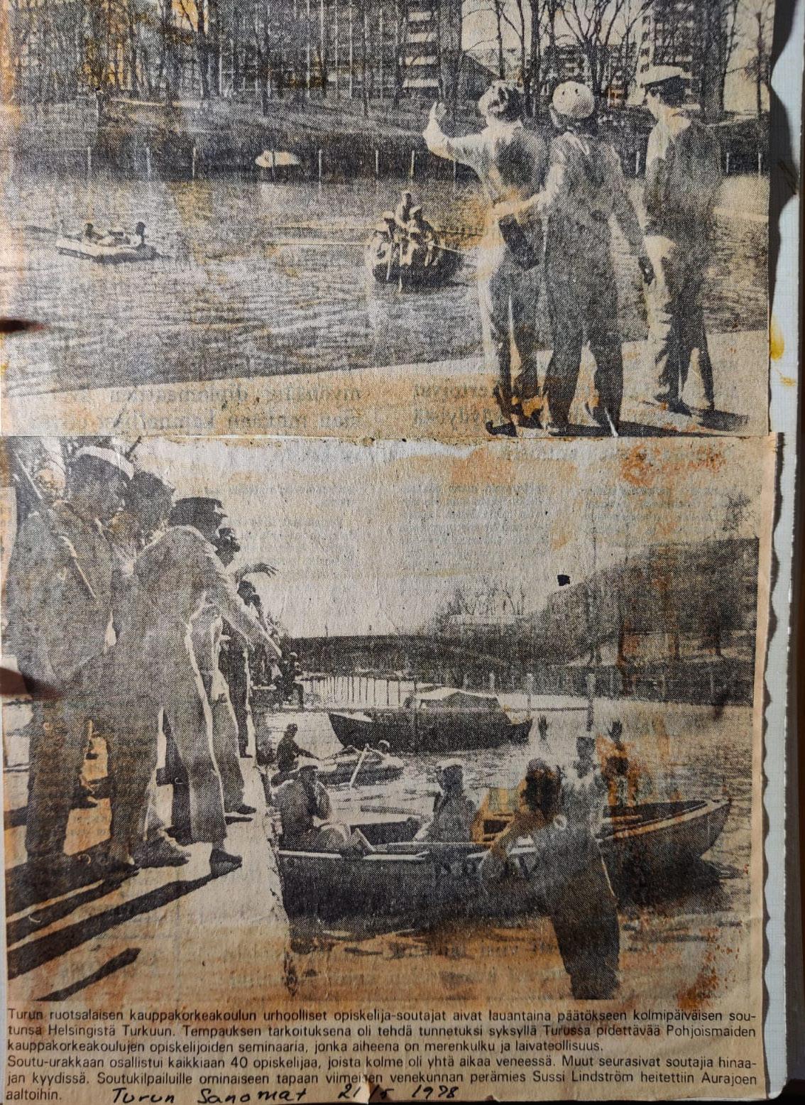 Loggen har tydligen tappats bort för resten av vägen? Sidorna är suddiga och jag kan ännu också känna doften av alkohol från dem. Otrolig resa! Nästa dag: 20.05.1978 c. 15:00 väntades roddarna vid Aura å vart de anlade elegant smått försenade kl. 20:00.