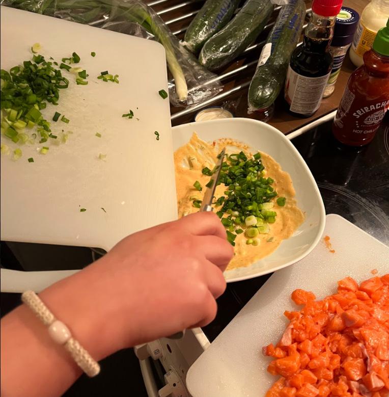 För den marinerade laxen behöver du: lax, vårlök, majonnäs, soya och srirachasås.