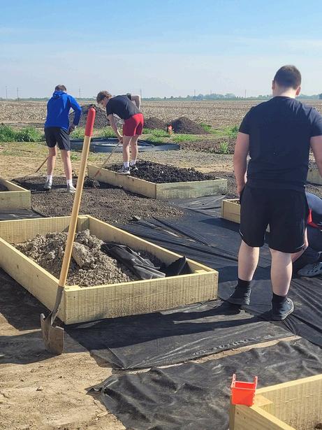 Junior high students work together to fill raised beds with soil for Waltham’s new educational garden — combining teamwork, science, and real-world learning.