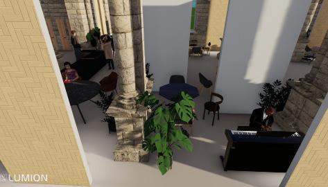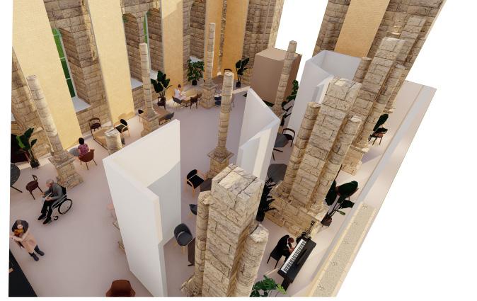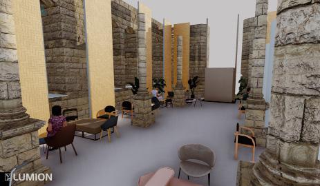 It is vital, including reconstructing the building as it was previously and linking it back to its heritage. After examining the conditions of the building, mainly the purpose and use of the sculpture hall, where it will be transformed into a music cafe by not altering the walls or physical changes, the wood design comes in place as a response to the cafe.