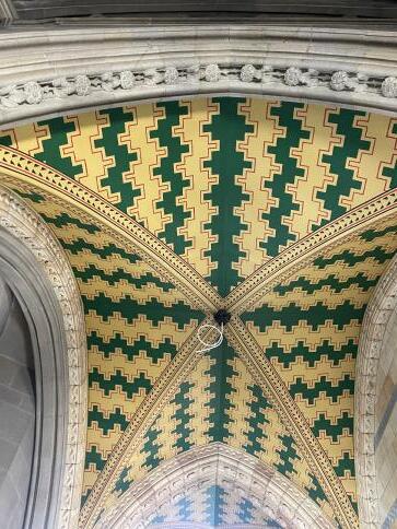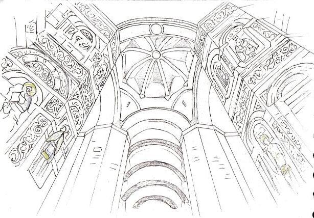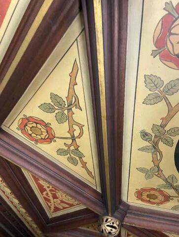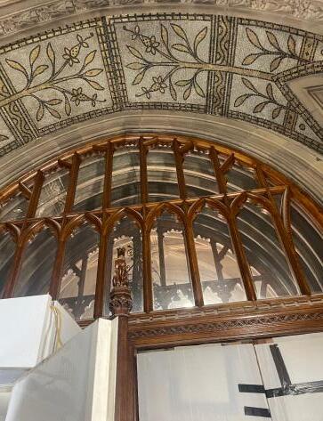 Description: currently under construction; butterfly vaulting arches with paintings, left as they were built; method of painting is gilding, which is thin sheets of gold real gold in the detailing on the roof, the heritage kept intact.
