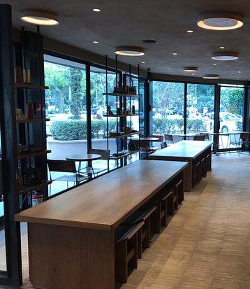 the architects also focus making these tables and chairs low so its accessible for anyone with disabilities, the area is very open and calm aethetically, calm nvironemtallows a person to be comforble in where they are sitted.