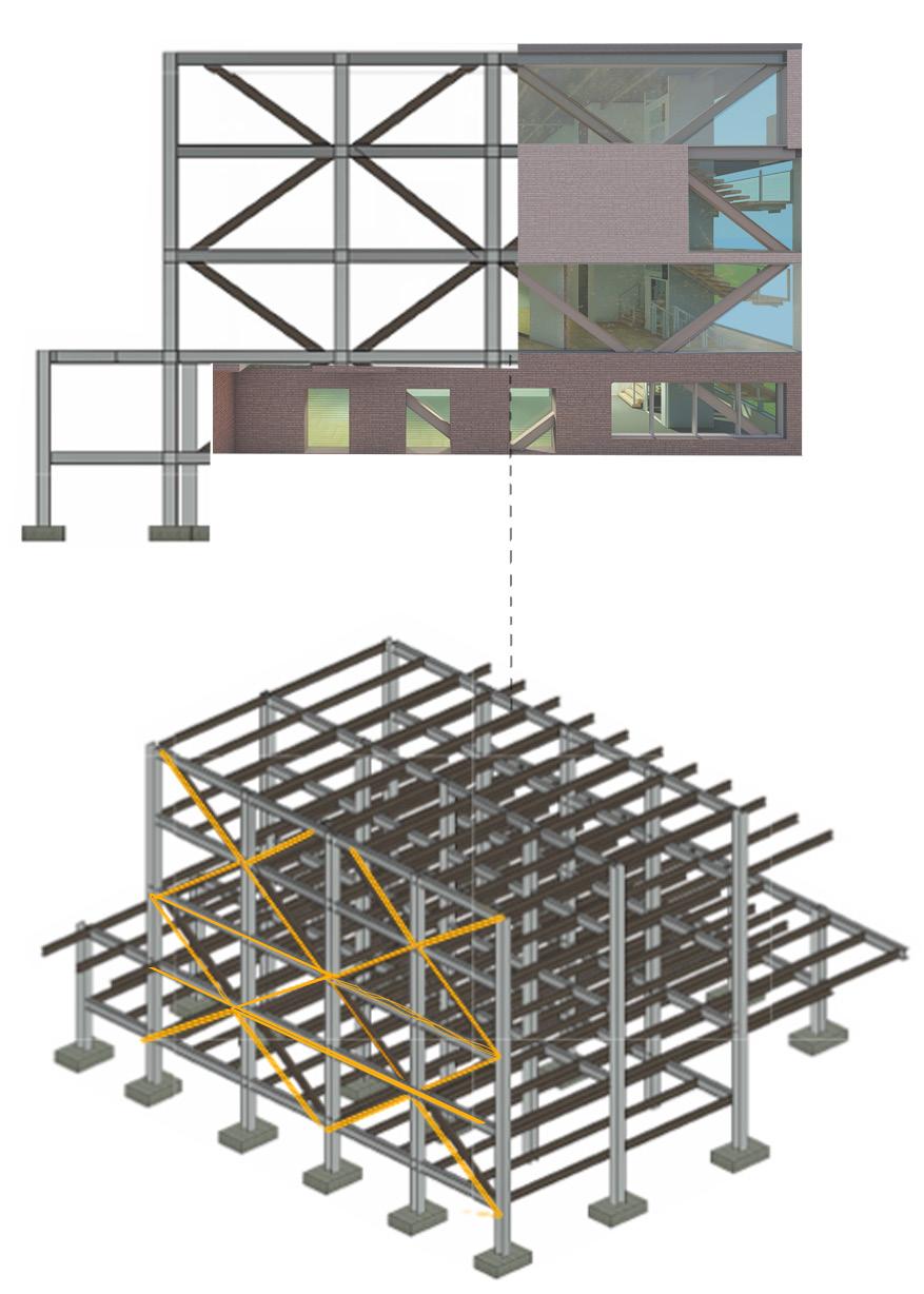 The leisure centre features a steel structural system for strength, durability, and sustainability. Steel beams and columns support the frame, with epoxy connections ensuring stability. Triple-glazed, steel-framed windows enhance weather resistance.