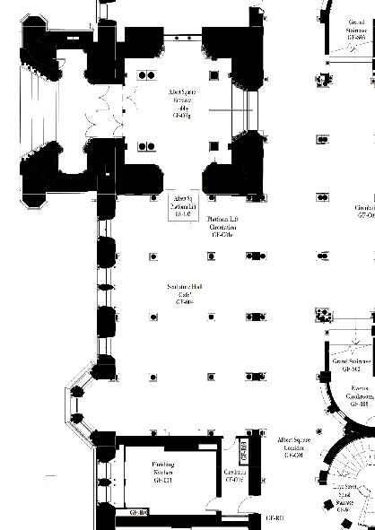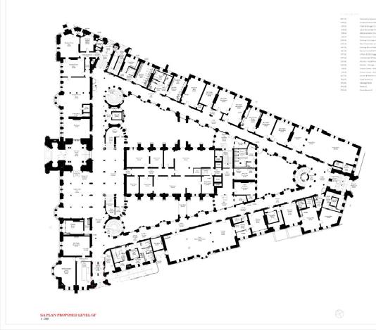 Over the last two years, labour has primarily involved stripping out old and redundant services to construct new ones: drainage, installing new plants and machinery (including seven new lifts) and restoring the existing building fabric. The spiral staircases, and the central corridor with periphery internal spaces, enclose the Great Hall and Police Station in the central area.